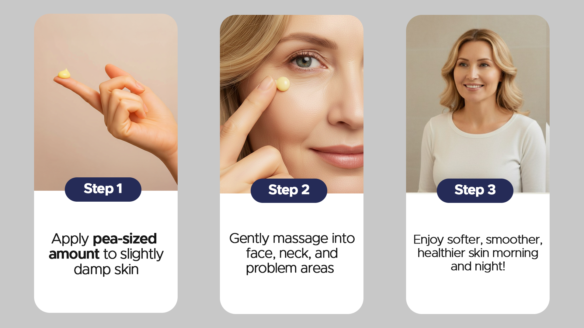 Apply morning and night to slightly damp skin. No rinsing needed. A pea-sized amount goes a long way.