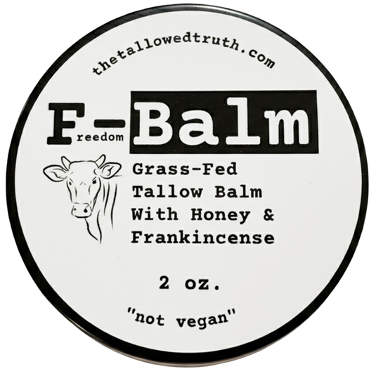 Original F-Balm: 100% Canadian grass-fed tallow, organic cold-pressed olive oil, Ontario beeswax, Ontario raw honey, frankincense essential oil (non-GMO, non-synthetic)